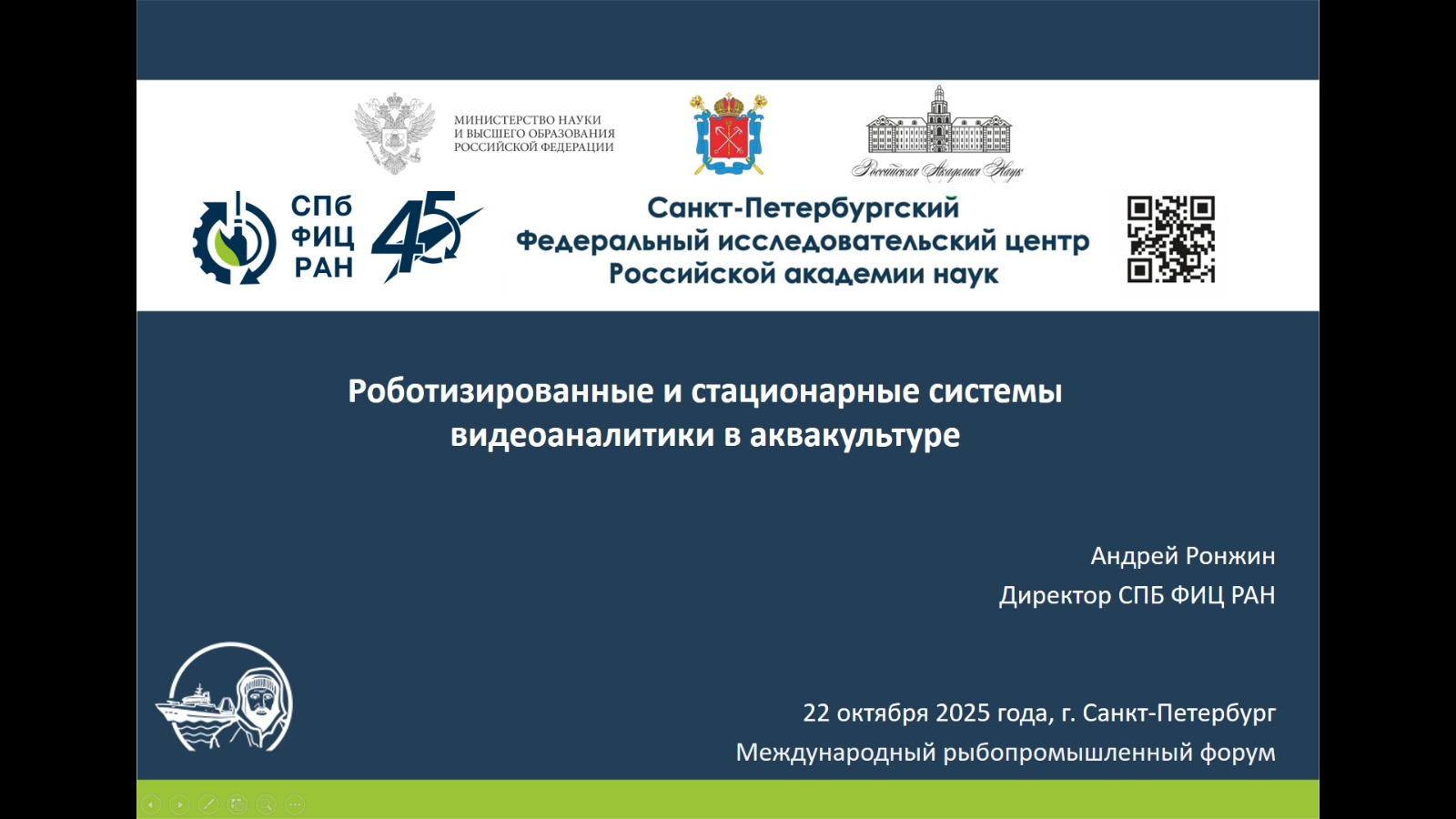 Андрей Ронжин, директор СПБ ФИЦ РАН представил роботизированные и стационарные системы видеоаналитики в аквакультуре, разработанные учеными Санкт-Петербургского института информатики и автоматизации Российской академии наук (СПИИРАН – СПБ ФИЦ РАН), а также научные задачи по экологическому мониторингу рыбоводческих хозяйств, успешно реализуемые специалистами Института озероведения Российской академии наук (ИНОЗ РАН – СПБ ФИЦ РАН).