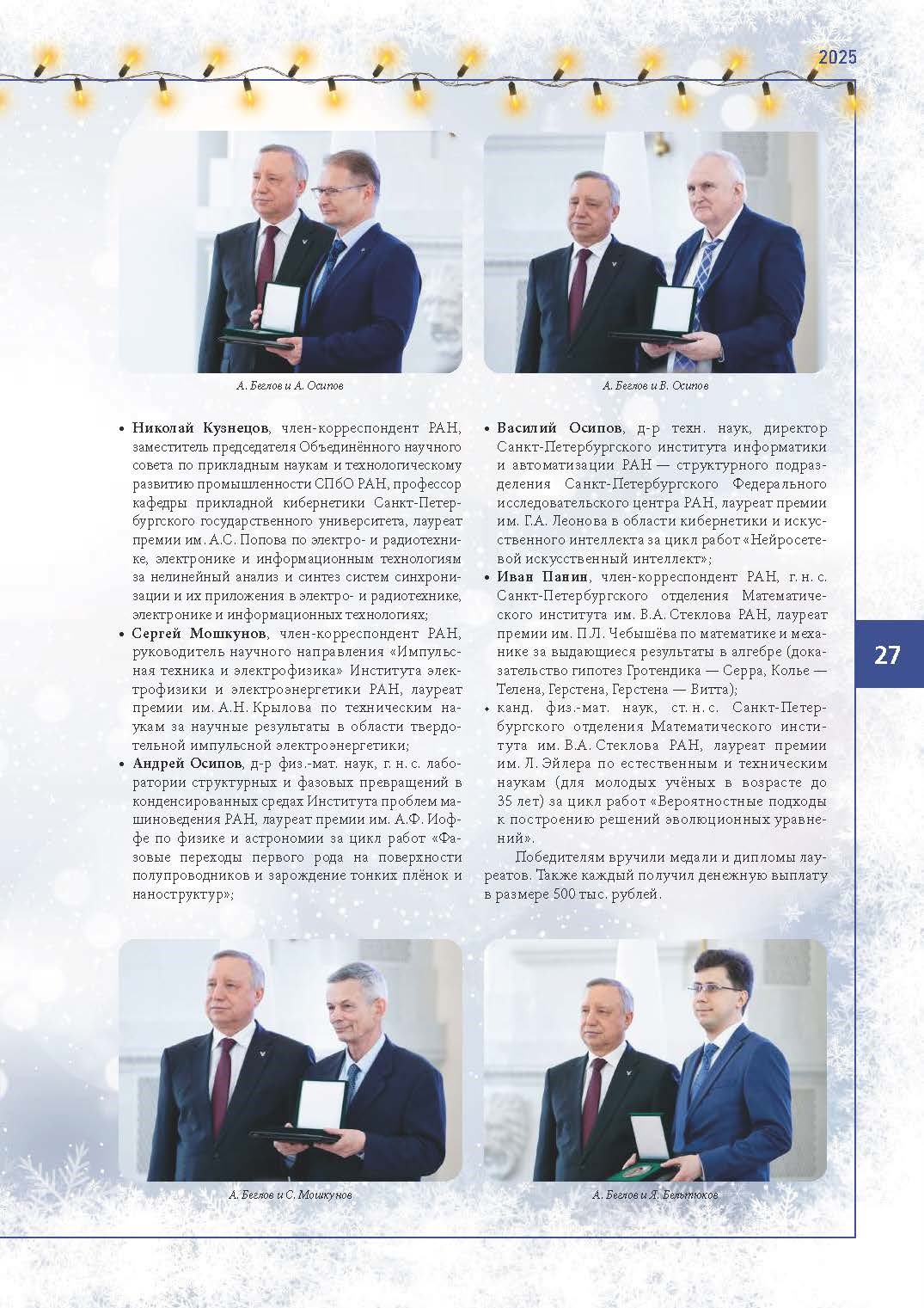 Одна из ключевых публикаций рубрики “Награды и премии” была посвящена объявлению победителей премии Правительства Санкт-Петербурга за выдающиеся научные результаты в области науки и техники. Среди лауреатов – директор Санкт-Петербургского института информатики и автоматизации (СПИИРАН) СПб ФИЦ РАН Василий Осипов. Он удостоен премии им. Г.А. Леонова в области кибернетики и искусственного интеллекта за цикл работ «Нейросетевой искусственный интеллект». (страница 26).